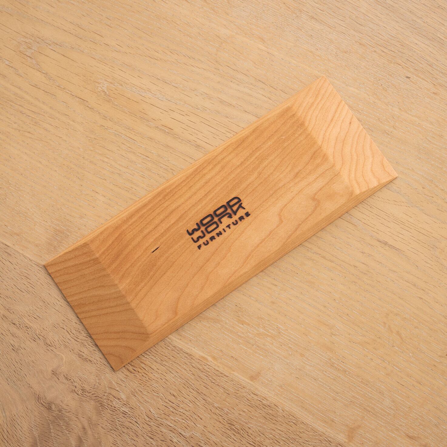 無垢の木のフリートレーです。お菓子を置いたり、カップを置いたり、お好きなものを置いてお使いください。四方はシャープに角度が付いているので、すっと持ち上げることができます。 おもに家具をつくるのと同じ、ウォールナット、チェリー、ナラ、タモの4樹種で製作しています。そのほか、その時々にでた端材で作るため、様々な樹種も登場します。